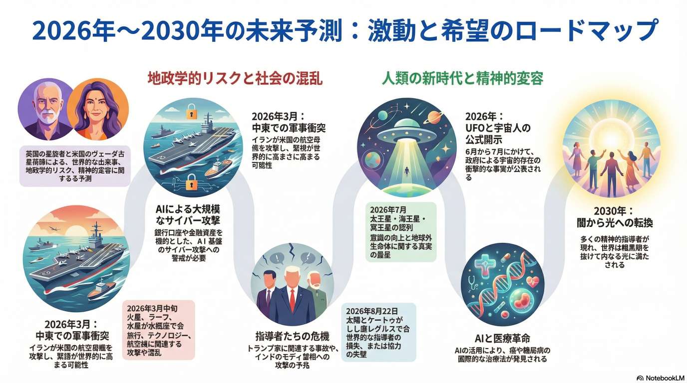両氏は、イランによる米国空母への攻撃やトランプ家を襲う災難、さらにはUFO情報の公表といった重大な転換点が数ヶ月以内に訪れると警鐘を鳴らしています。また、AI技術の進化が医療革命や古代の知恵と融合した新しい占いツールの開発をもたらすと説いています。