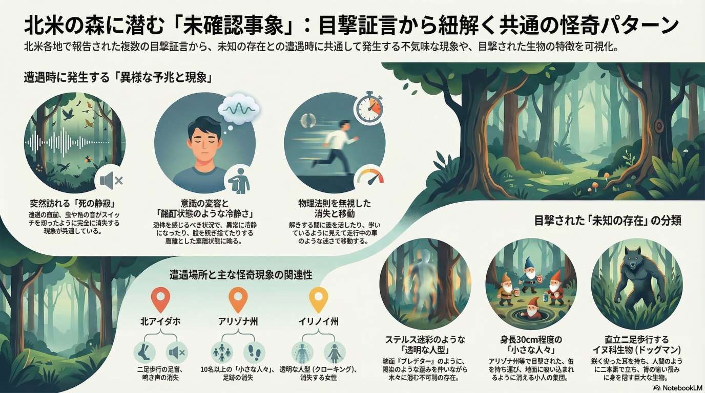 アイダホ州の森で聞こえた二足歩行の不気味な足音や、アリゾナ州で目撃されたスパム缶を運ぶ小人など、北米各地で起きた恐ろしい遭遇事件が紹介されています。