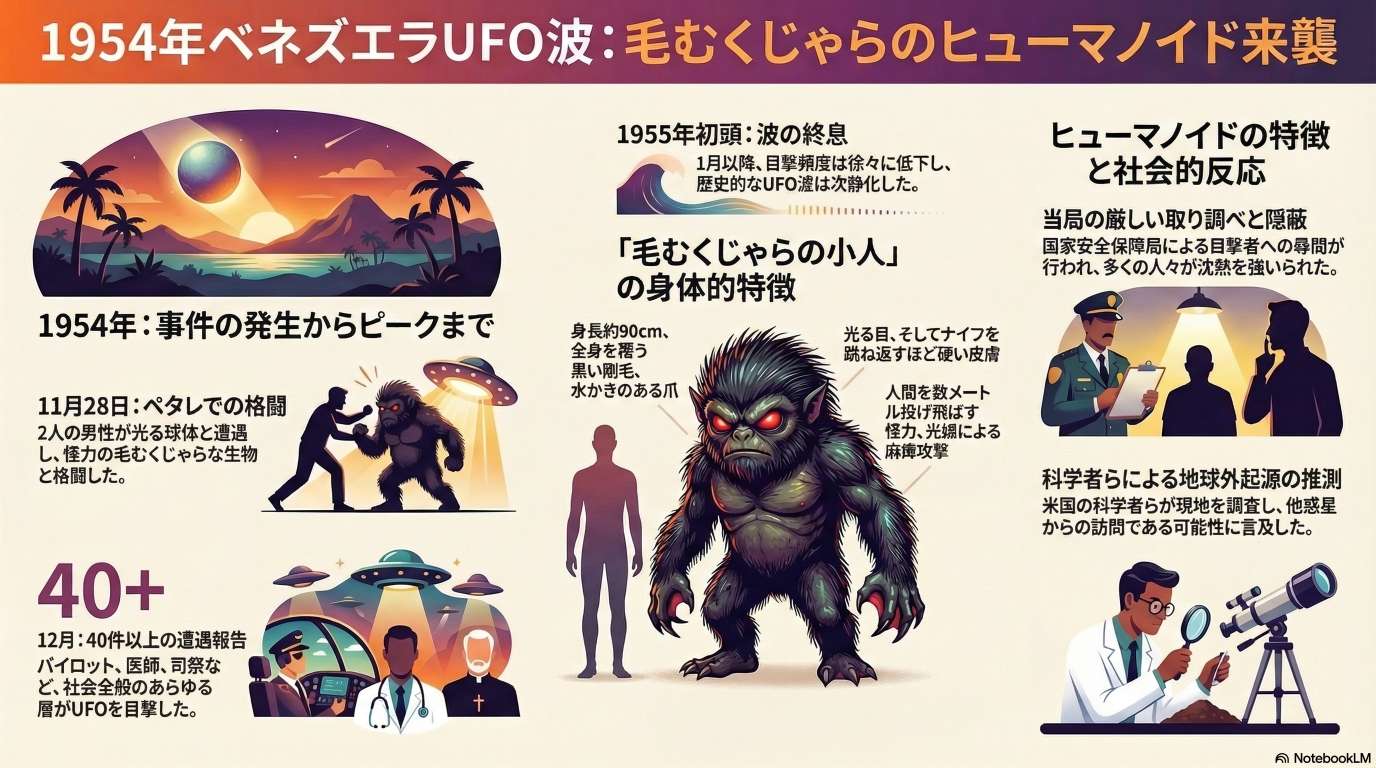 この資料は、1954年にベネズエラで発生した大規模なUFO目撃の波と、それに伴う「毛むくじゃらのヒューマノイド」との遭遇事件を詳細に記録したものです。