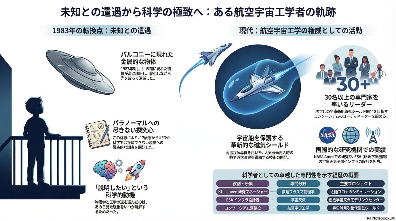 驚くべきことに、彼の輝かしいキャリアの原点は、1983年に家族と共に目撃した謎の飛行物体(UFO)との遭遇にあります。この不可解な現象を科学的に解明したいという強い好奇心が、彼をプラズマ物理学や宇宙工学の研究へと駆り立てました。