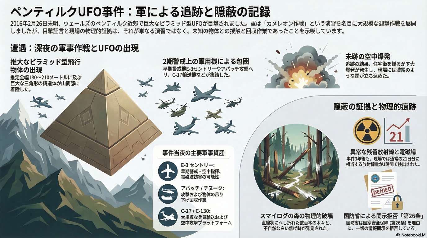 2016年2月26日未明、ウェールズの首都カーディフ近郊の村ペンティルチ(Pentyrch)において、大規模なUFO目撃事案および軍事作戦が発生した。主要目撃者であるカズ・クラーク(Caz Clarke)の証言と、主任調査官ガリ・ジョーンズ(Gari Jones)による調査結果は、巨大なピラミッド型飛行物体の出現、それに対する軍の追跡および撃墜、そしてその後の組織的な隠蔽工作を強く示唆している。