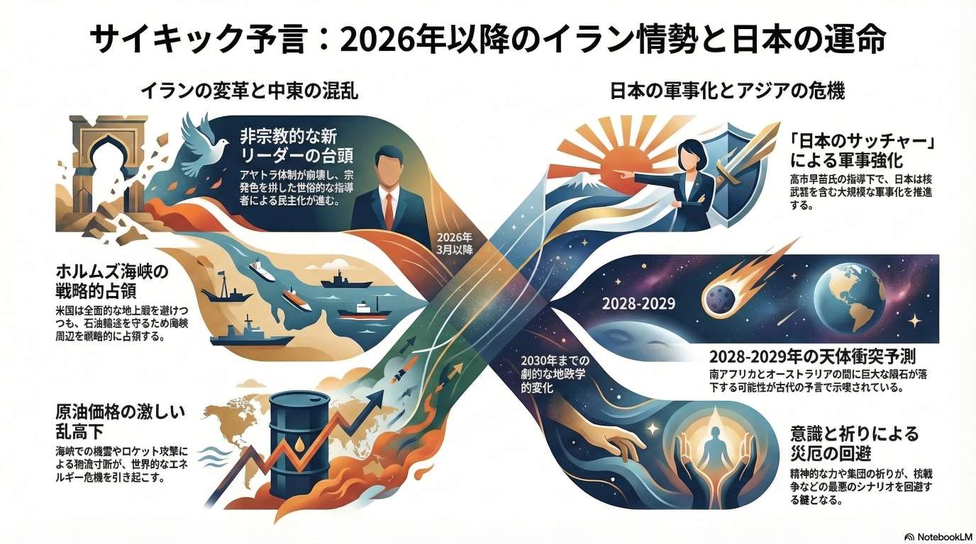 氏はイランでの政権交代やドナルド・トランプ氏による軍事介入、ホルムズ海峡の封鎖に伴う原油価格の高騰を予測しています。また、日本が防衛力を強化し、新しい指導者のもとで結束を強める未来や、2029年頃に懸念される巨大隕石の衝突についても言及しています。