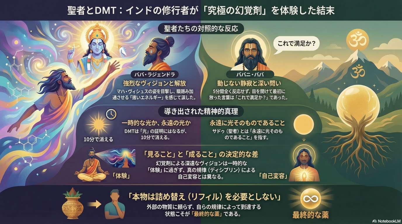 古代から伝わる修行で自己の解脱を追求するサドゥーやアゴリが、化学物質による精神変容にどう反応するかを検証しています。ある聖者は神のビジョンを目にしましたが、厳しい修行を積んだアゴリの聖者は、その効果を認めつつも「一過性の光」に過ぎないと冷静に指摘しました。この経験を通じて、投稿者は薬物による一時的な神秘体験と、生涯をかけた自己規律によ る精神的到達の違いを学んでいます。