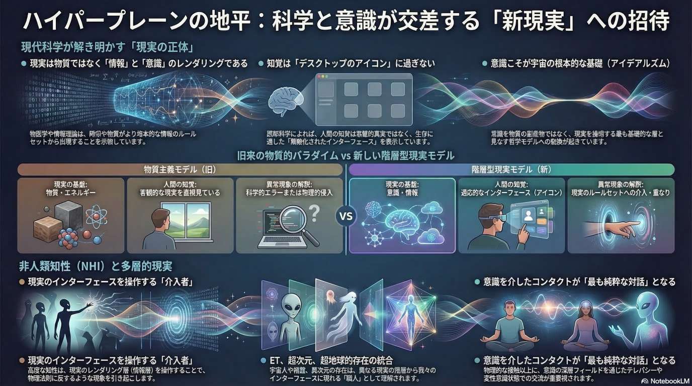 著者は、現実の本質が物質的なものではなく、意識や情報を基盤とした多層的な構造であるという新たなパラダイムを提示しています。物理学や認知科学の進展により、私たちが知覚する世界は一種のインターフェースに過ぎず、異次元的な存在はその背後の層から干渉している可能性が示唆されています。