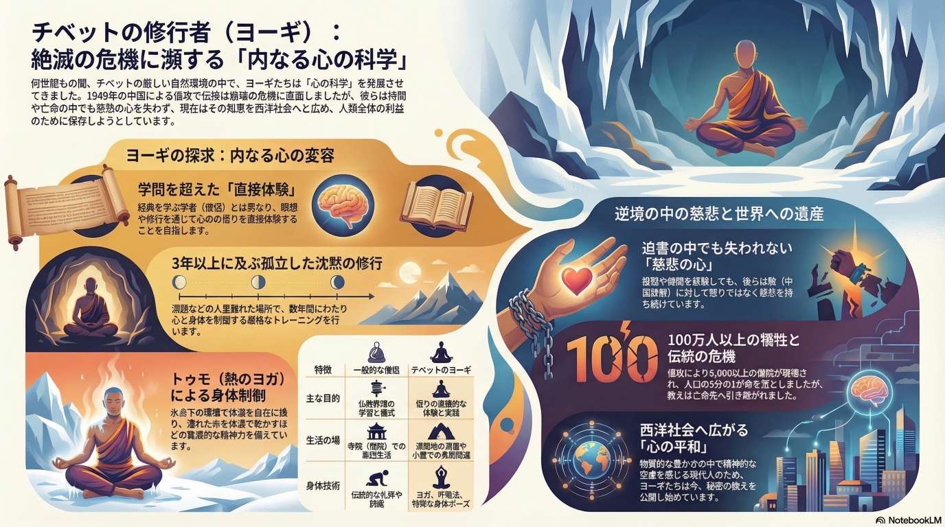 本文書は、かつて外部との接触を断絶していた「雪の国」チベットにおいて育まれた、独自の精神伝統とその実践者であ る「ヨギ(修行者)」に関する包括的な報告である。チベットの過酷な自然環境は、人々の関心を外的な物質世界から内的な精神世界へと向かわせ、インドから伝来した仏教と土着の信仰が融合することで、世界でも類を見ない「心の科学」が確立された。