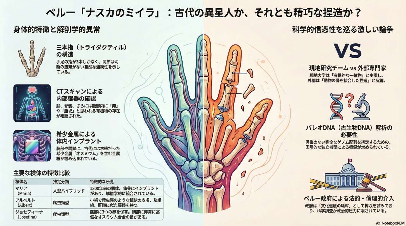 このテキストは、ペルーで発見された「ナスカのミイラ」と呼ばれる三本指の奇妙な遺体の真偽をめぐる調査報告です。ジャーナリストのロス・コールタート氏が現地を訪れ、非人類やエイリアンの可能性を主張する科学者と、それらを偽造物と断じる懐疑派の両方に取材を行っています。