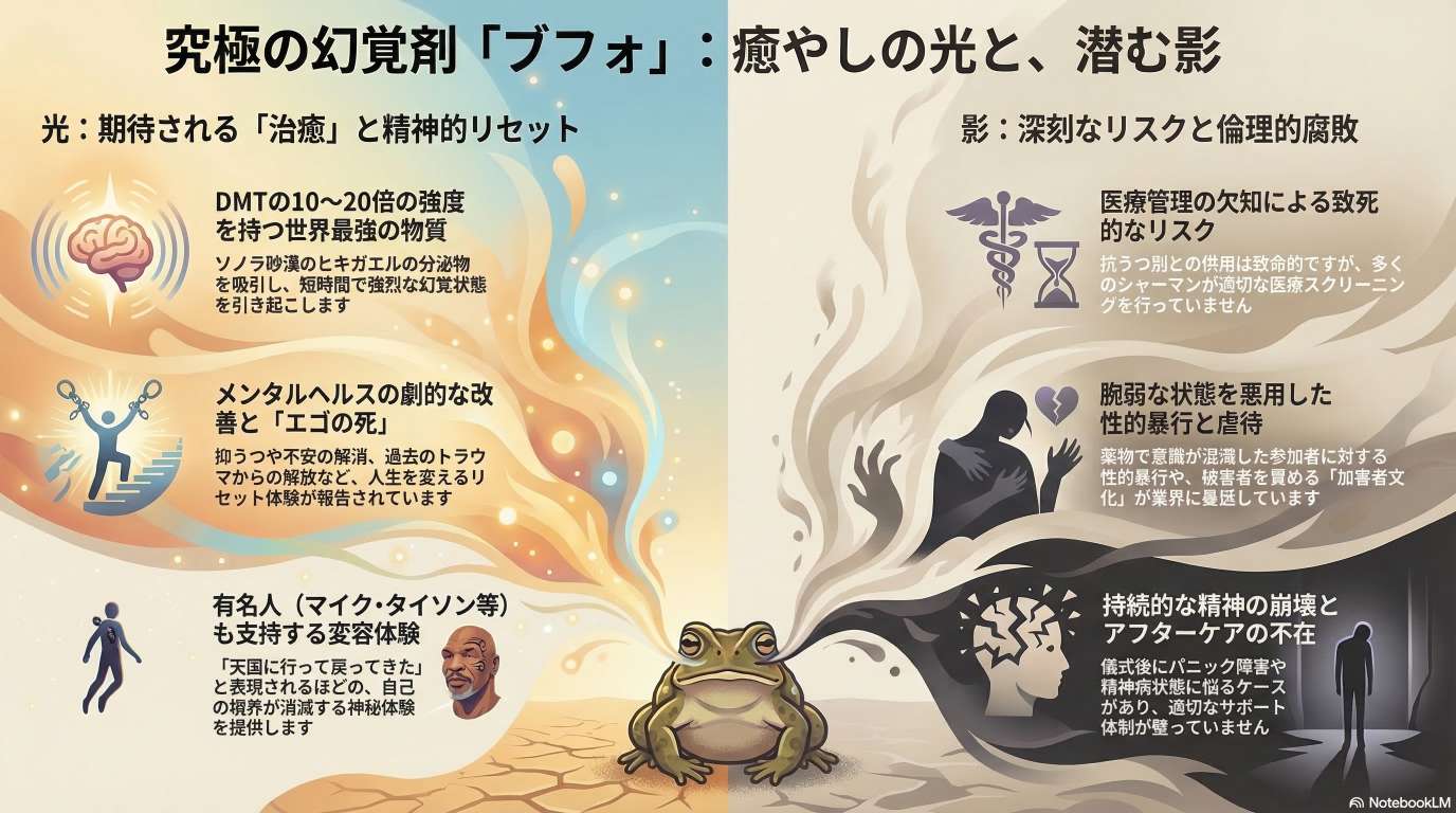 一部の提供者は被害者に責任を転嫁するような危険な認識を持っており、業界全体における安全管理と倫理的な規制の欠如が浮き彫りになっています。強力な精神的変容をもたらすこの物質には、計り知れない救いと同時に、深刻なトラウマや死を招く危険性が隣り合わせに存在しているのです。