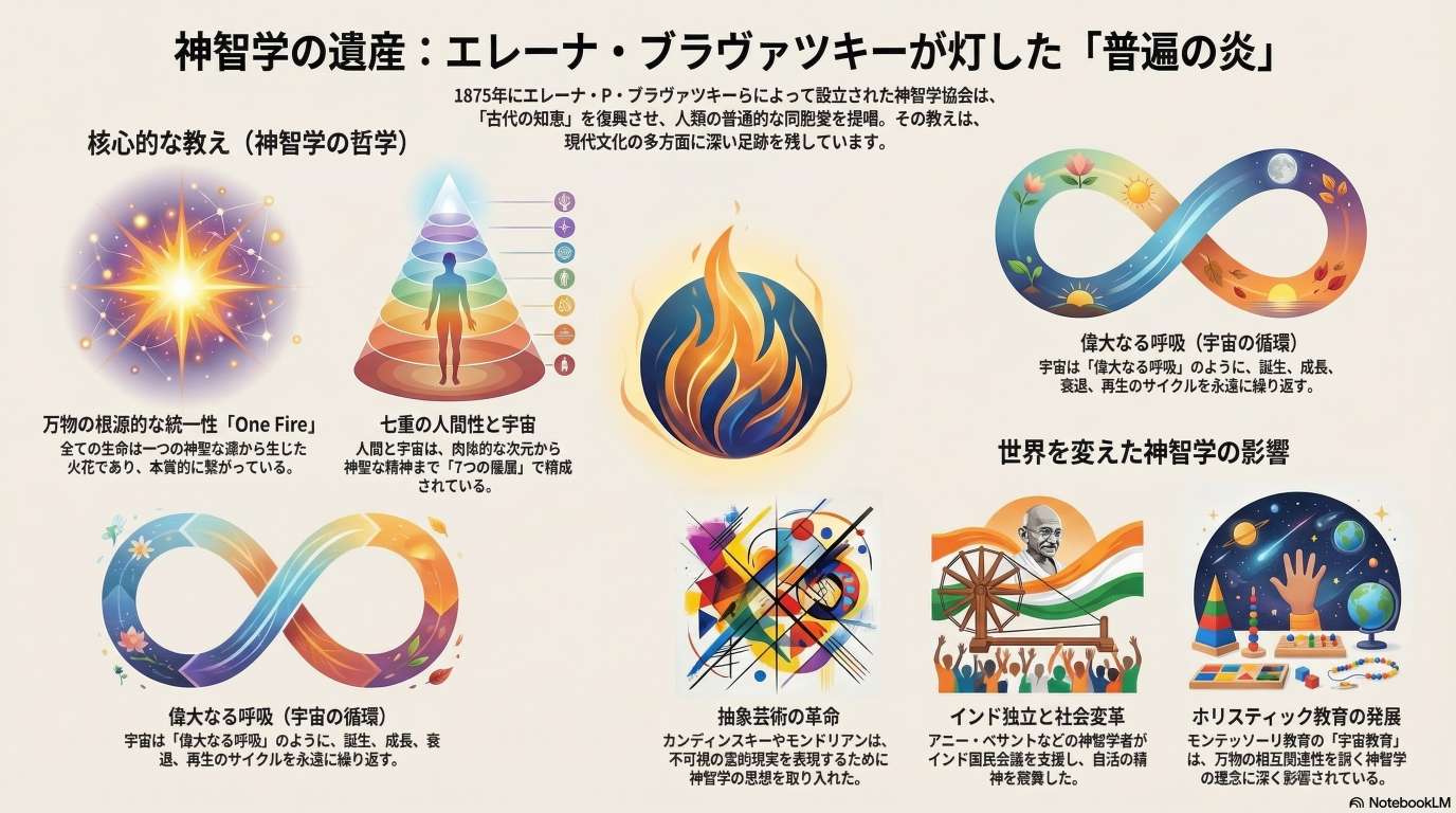 その影響は精神世界に留まらず、インドの独立運動、抽象芸術の誕生、革新的な教育方法(モンテッソーリ教育など)、そして現代の科学的思考にまで及んでいる。神智学の核心は「万物の根源的な一性(Oneness)」と「人類の普遍的同胞愛」の構築にあり、その遺産は「リンクを途絶えさせるな」というブラヴァツキーの遺訓とともに、今日まで受け継がれている。