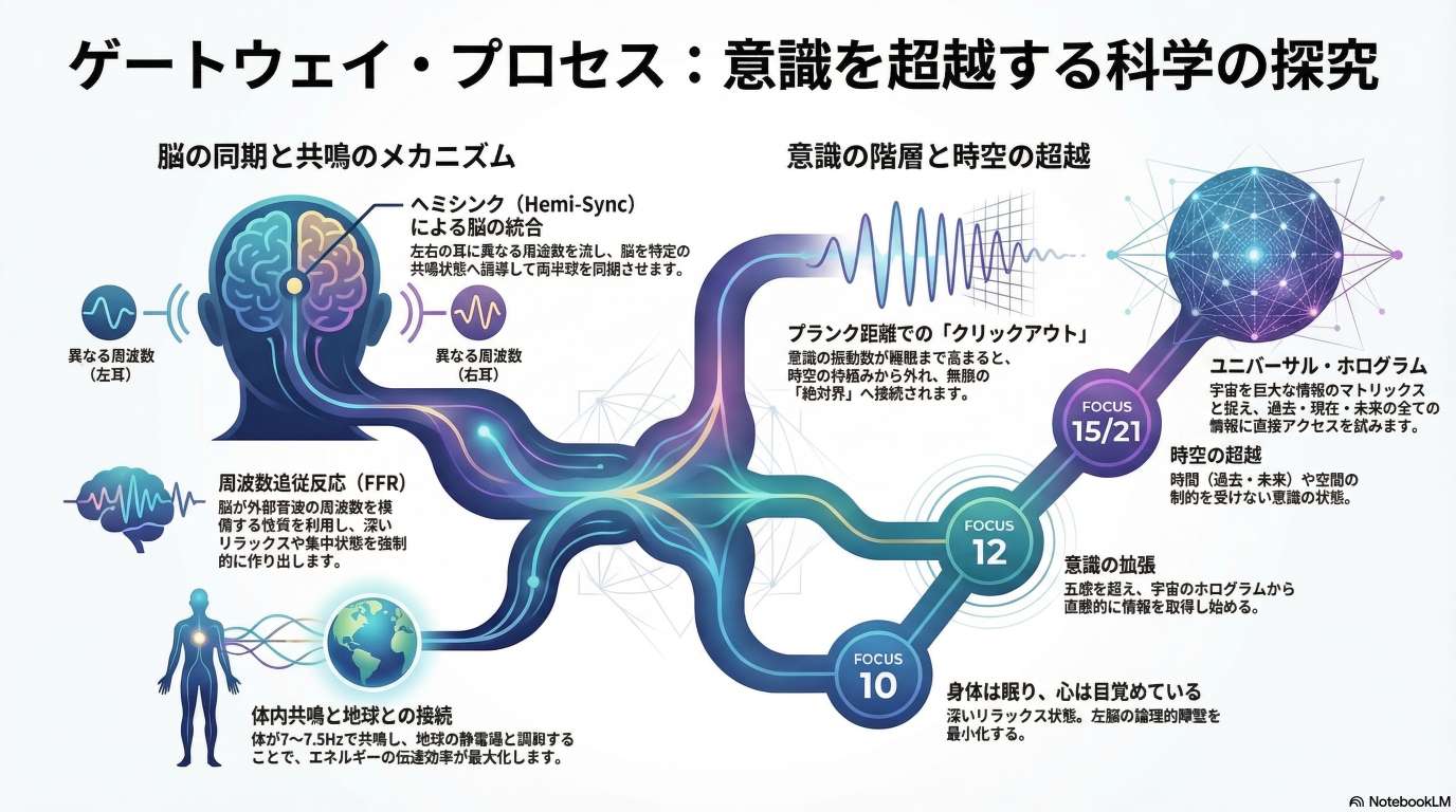 この研究は、モンロー研究所が開発したヘミシンク技術を用い、脳の両半球を同期させることで、変性意識状態や体外離脱を科学的に解明しようとしたものです。著者は、量子力学や生物学的モデル、ホログラム理論を 駆使して、人間が時空の制限を超えて宇宙のエネルギーと統合するメカニズムを論じています。さらに、この技術を情報収集や自己成長、さらには治療や過去・未来へのアクセスに応用する可能性が示唆されています。