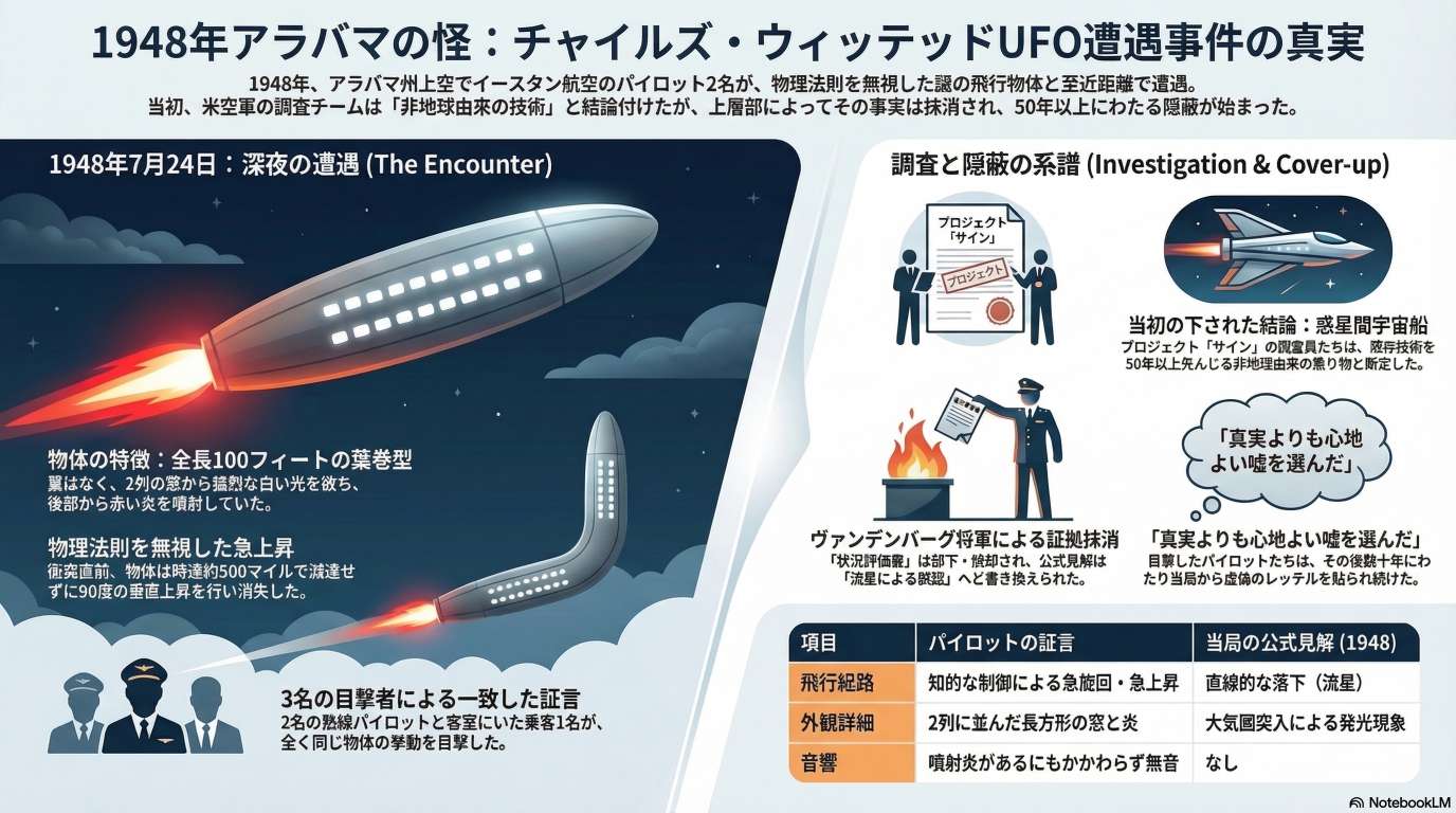 本文書は、1948年7月24日にアラバマ州上空で発生したイースタン航空576便による未確認飛行物体(UFO)遭遇事件、通称「チャイルズ・ウィテッド事件」と、その後に続く米空軍による組織的な隠蔽工作を詳細にまとめたものである。