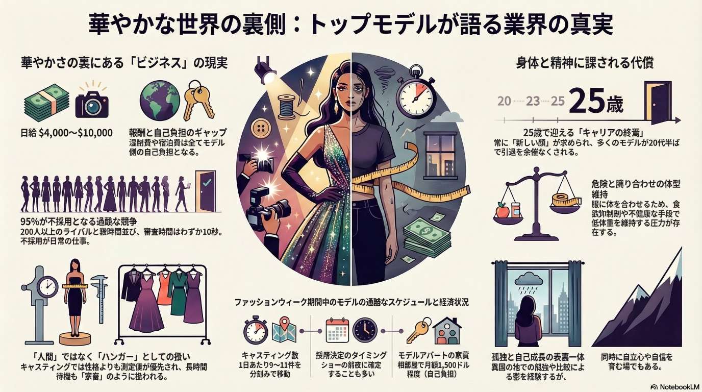 若くしてディオールやシャネルのショーで活躍する彼女は、高額な報酬や海外生活に魅力を感じる一方で、常に付きまとう体型管理の圧力や孤独、深刻な外見至上主義について率直に語っています。特に、厳しい食事制限や薬物使用が蔓延する業界の闇、そして新人を「使い捨ての玩具」の ように扱う冷徹な側面が強調されています。一方で、彼女を支える父親の愛情深い視点も描かれ、夢を追う代償としてのメンタルヘルスへの影響が多角的に考察されています。