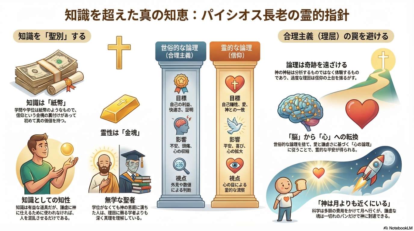 長老は、神格化されていない世俗的な論理や科学的知識は高慢を生み、人間を真の平安から遠ざけてしまうと説いています。対照的に、謙遜と深い信仰心こそが神の恵みを受け取るための不可欠な条件であり、それによってのみ知識が聖なるものへと昇華されると強調しています。また、自己犠牲の精神が欠如した現代の若者や、行き過ぎた自由が招く不敬な態度を嘆き、霊的な指導者に従うことの大切さを説いています。