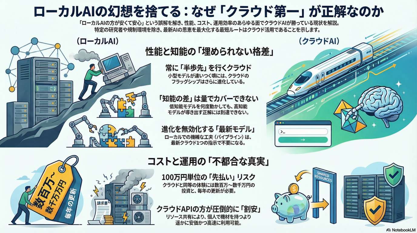 著者は、最新のクラウドAIサービスを利用することこそが、性能・費用・運用効率のすべてにおいて圧倒的に有利であると断言しています。ローカル環境で動く小型モデルが進化しても、巨大なリソースを背景とするクラウドのフラグシップモデルとの性能差は埋まらず、知能の差が成果に直結すると説いています。また、導入費用や電気代を考慮するとローカル運用は決して安価ではなく、セキュリティや管理の面でも専門家が運営するクラウドの方が強固です。