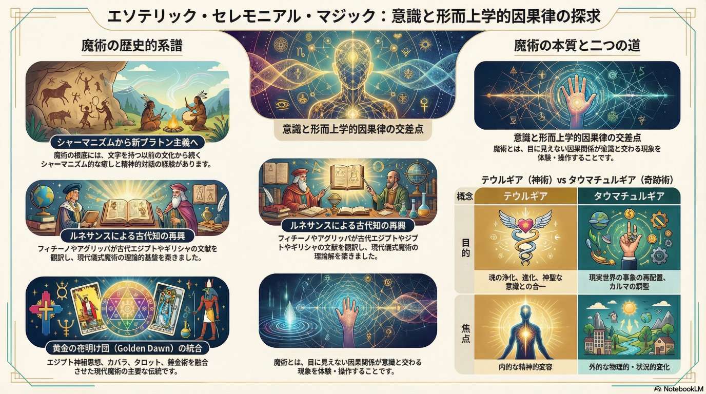 魔術は単なる迷信ではなく、「意識の現象学と形 而上学的因果関係の交差点」として再定義される。その起源は文字記録以前のシャーマニズムに遡り、古代ギリシアのプラトン主義、ネオプラトニズム(新プラトン主義)、ルネサンス期の人間主義を経て、19世紀の「黄金の夜明け団(Golden Dawn)」による統合へと至る。