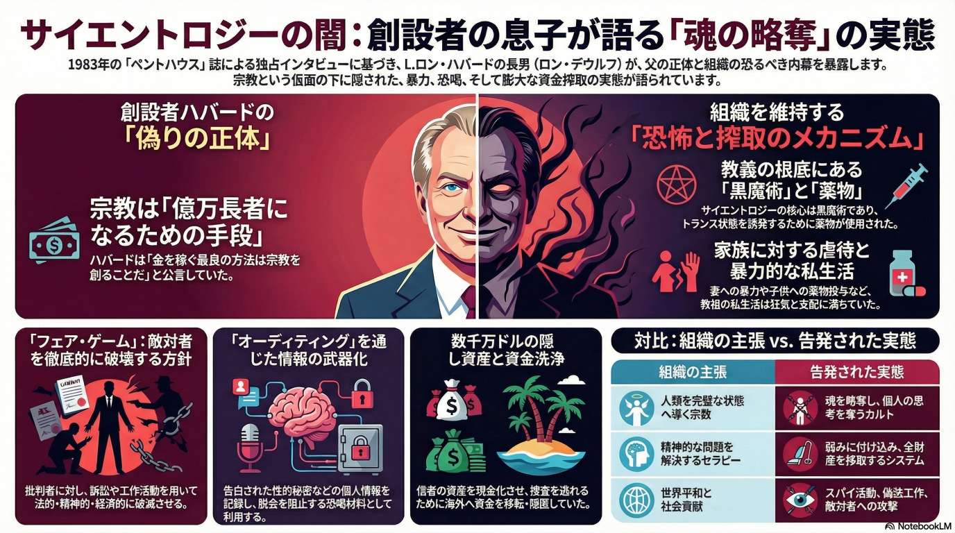 この資料は、サイエントロジー創設者の息子であるL・ロン・ハバード・ジュニアへの独占インタビューを中心に、組織の隠された実態を告発しています。