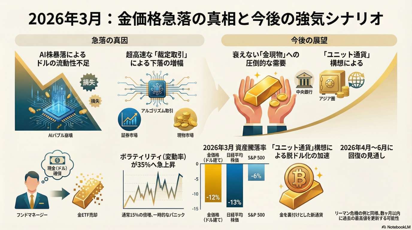 歴史的なリーマンショック時の事例と比較しつつ、現在はBRICS諸国による脱ドル化や「ユニット通貨」構想などの 構造的な要因があるため、金の実需は依然として強力であると説いています。結論として、今回の下落は一時的な調整に過ぎず、早ければ同年4月頃から上昇トレンドに回帰すると予測し、投資家にとっての好機であると述べています。
