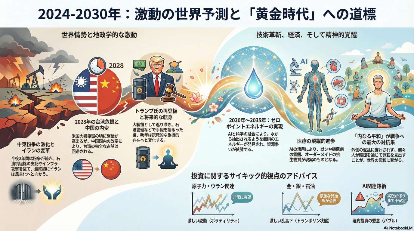 中東での軍事衝突の激化やイランの体制崩壊、トランプ氏の再選、中国による台湾への圧力など、地政学的な動向が広範囲に予測されています。また、エネルギー危機や食料不足、AIの進化といった社会経済的な課題に加え、イギリス王室の将来や著名人のスキャンダルにも言及しています。