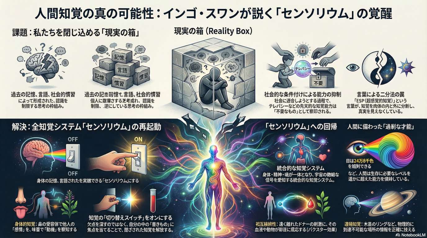 氏は、自身の超能力が社会的偏見や教育によって抑制されてきた経験を語り、人間が本来持つ「センソリウム(全感覚器官)」という巨大な潜在能力について解説しています。