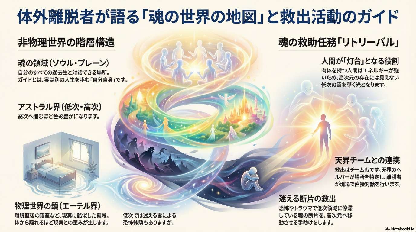 彼は、自身の寝室から始まり、アストラル界や死後の世界、さらには魂の領域へと至る多層的な次元の構造を詳しく解説しています。また、迷える霊を救助する「リトリーバル」という活動や、過去生との交流、守護霊の正体についても独自の視点を提示しています。意識を集中させる技術や、明晰夢から体外離脱へ移行する方法など、実践的なアドバイスも含まれています。