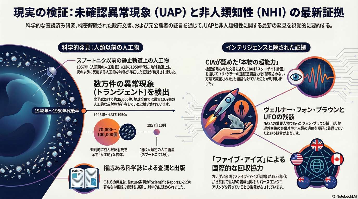 前半では、人類初の人工衛星スプートニク以前の時代に、静止軌道上に人工的な反射構造物が存在したことを示唆する査読済み論文が紹介されています。