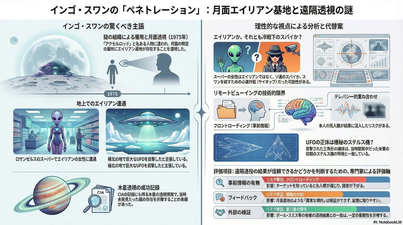 この出典は、超能力者 Ingo Swann が記した月面のエイリアン基地に関する主張と、その信憑性を科学と信仰の両面から検証するポッドキャストの書き起こしです。