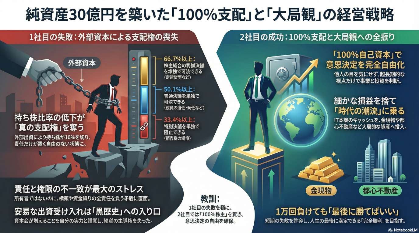 かつて外部資本を受け入れ、持ち株比率の低下と横領被害によってどん底のマイナスを経験した教訓から、著者は「自社株100%の保持」の重要性 を説いています。他人の介入を排除し、会社を完全に支配することで、目先の利益に惑わされない超長期的な視点での経営が可能になると主張しています。