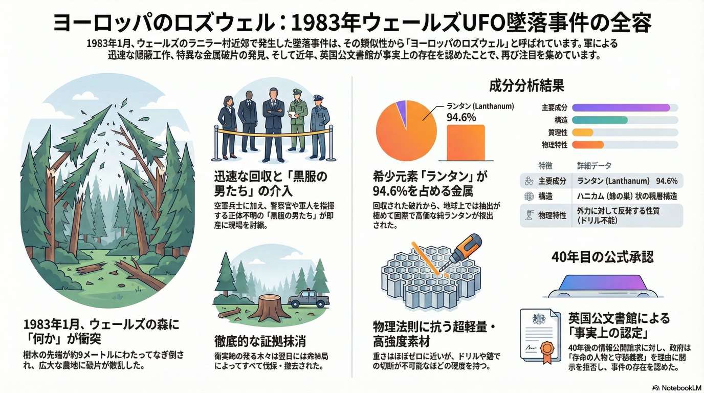 事件当時、現場には謎の回収部隊が現れ、広範囲に散らばった特殊な金属破片を隠蔽するように持ち去った経緯が語られています。オリー氏による最新の科学分析では、破片から地球上では精製が極めて困難な希少元素ランタンが大量に検出され、既存の航空技術を超越した性質が明らかになりました。